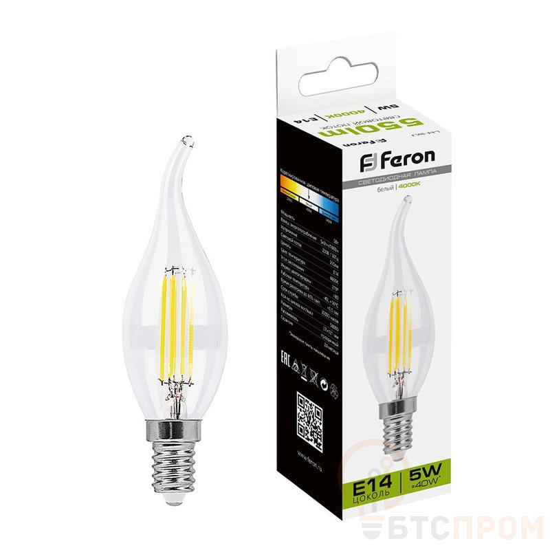Лампа светодиодная филамент FERON LB-59, C35T (свеча на ветру), 5W 230V E14 4000К (белый), рассеиватель прозрачный 550Lm, угол рассеивания 270°, 121*35мм