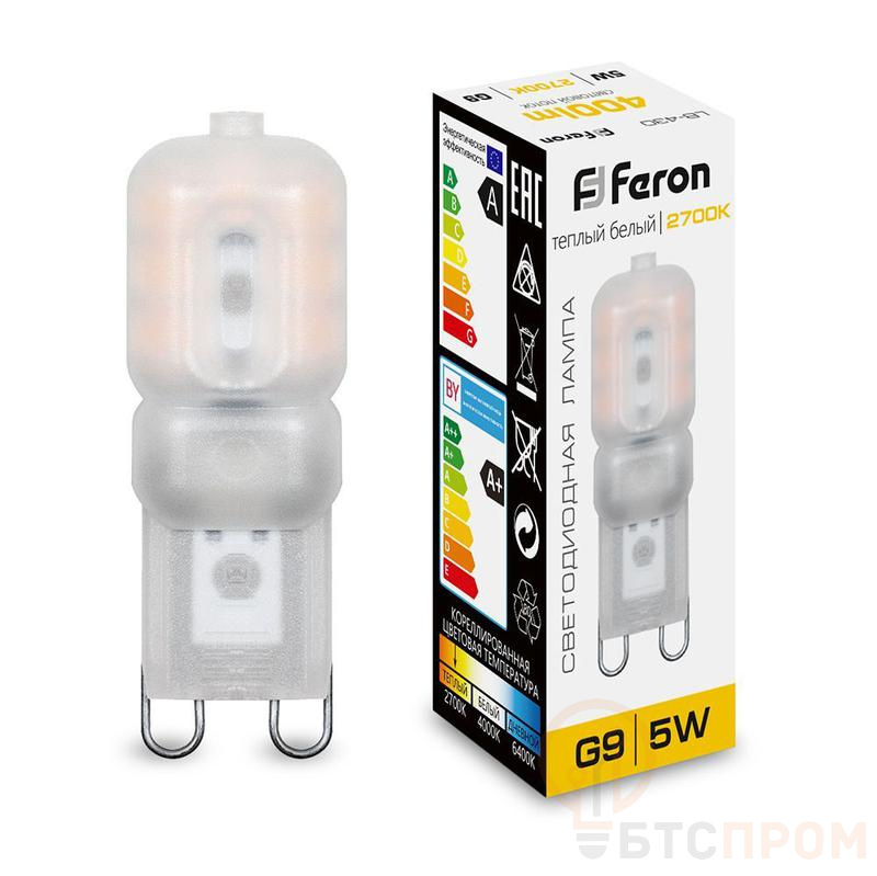 Лампа светодиодная FERON LB-430, JCD9 (капсульная), 5W 230V G9 2700К (белый теплый), рассеиватель матовый белый, 400Lm, угол рассеивания 270°, 47*16мм