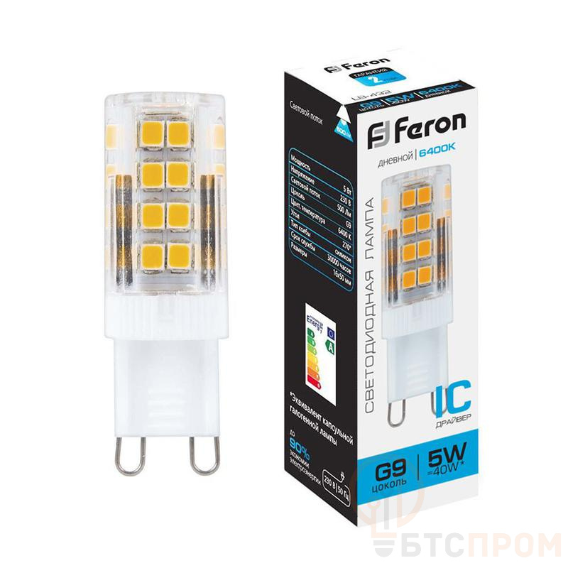 Лампа светодиодная FERON LB-432, JCD9 (капсульная), 5W 175-265V G9 6400К (дневной), рассеиватель прозрачный 500Lm, угол рассеивания 270°, 50*16мм