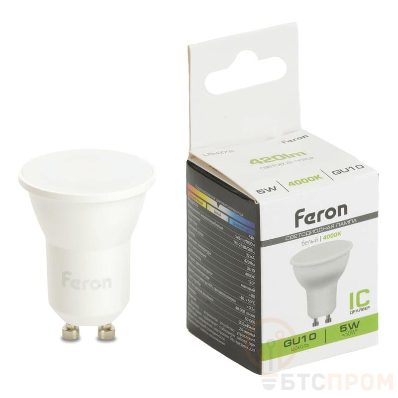 Лампа светодиодная FERON LB-272, MR11 (рефлекторная), 5W 175-265V GU10 4000К (белый), рассеиватель матовый белый, 420Lm, угол рассеивания 120°, корпус пластик, 45*35мм