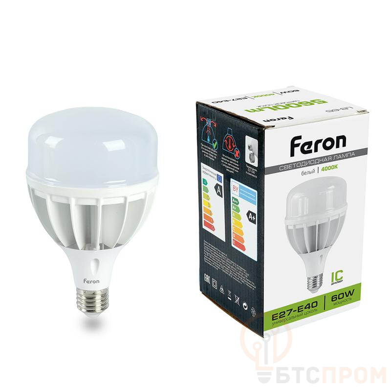 Лампа светодиодная FERON LB-65, T120 (промышленная), 60W 175-265V E27-E40 4000К (белый), рассеиватель матовый белый, 5600Lm, угол рассеивания 220°, 171*100мм