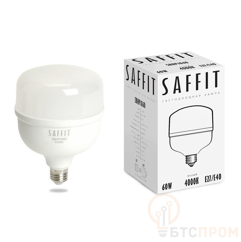 Лампа светодиодная SAFFIT SBHP1060, колба (промышленная), 60W 230V E27-E40 4000К (белый), рассеиватель матовый белый, 5600Lm, угол рассеивания 220°, 167*118мм
