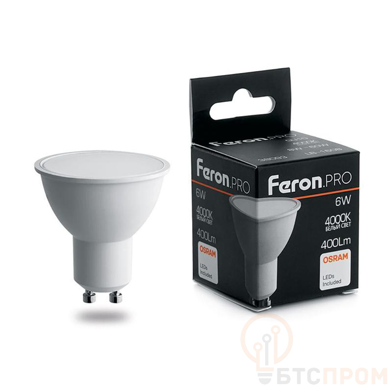 Лампа светодиодная FERON LB-1606, MR16 (рефлекторная), 6W 175-265V GU10 4000К (белый), рассеиватель матовый белый, 400Lm, угол рассеивания 120°, 57*50мм