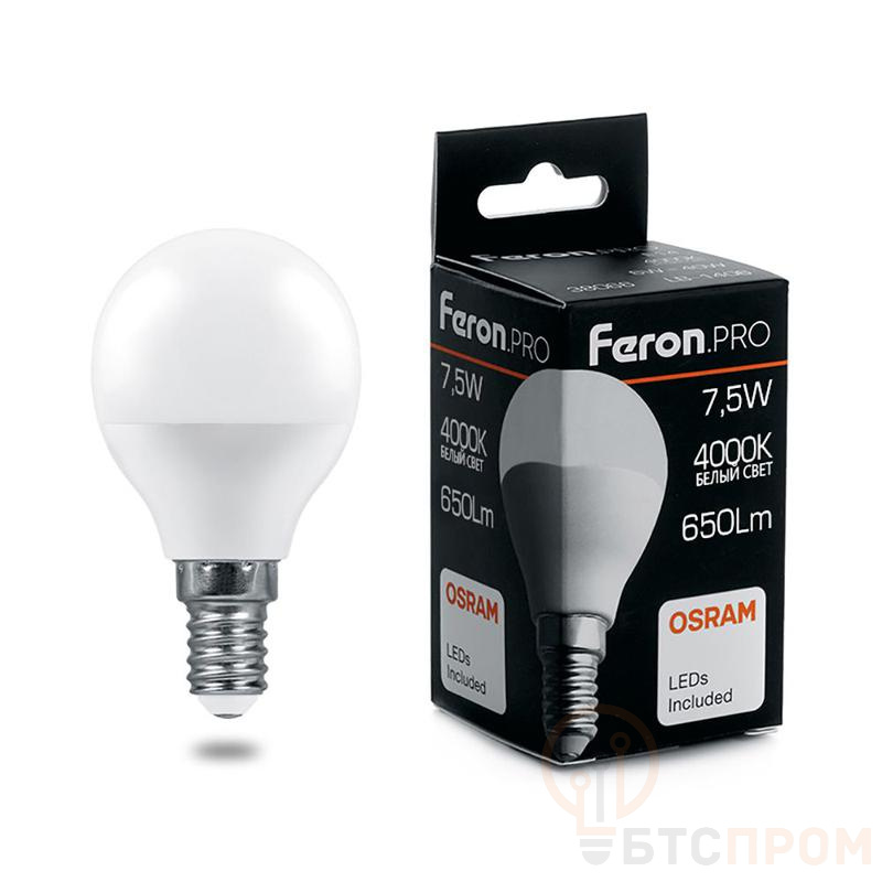 Лампа светодиодная FERON LB-1407, G45 (шар), 7.5W 175-265V E14 4000К (белый), рассеиватель матовый белый, 650Lm, угол рассеивания 220°, 81*45мм