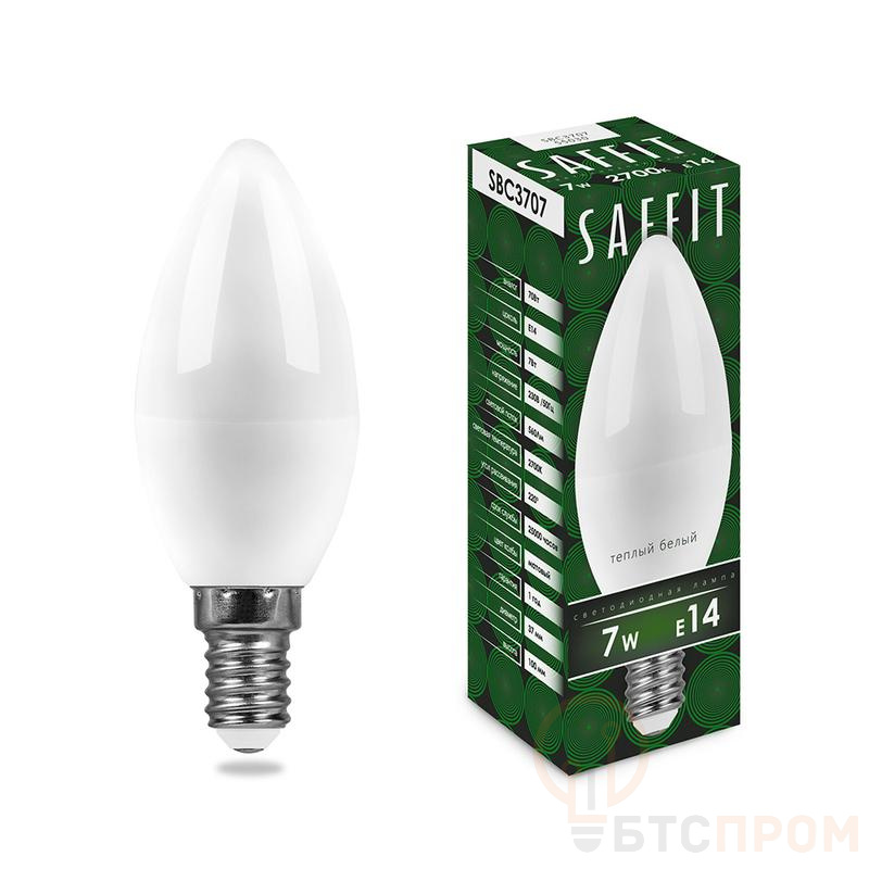 Лампа светодиодная SAFFIT SBC3707, C37 (свеча), 7W 230V E14 2700К (белый теплый), рассеиватель матовый белый, 560Lm, угол рассеивания 220°, корпус пластик, 100*37мм