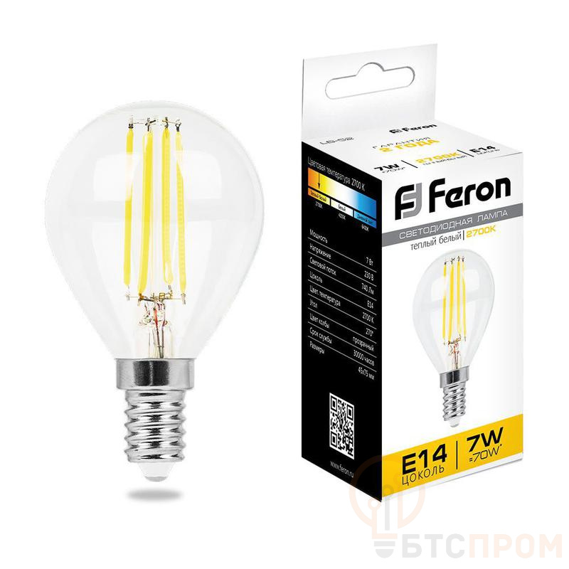 Лампа светодиодная филамент FERON LB-52, G45 (шар малый), 7W 230V E14 2700К (белый теплый), рассеиватель прозрачный 740Lm, угол рассеивания 270°, 75*45мм