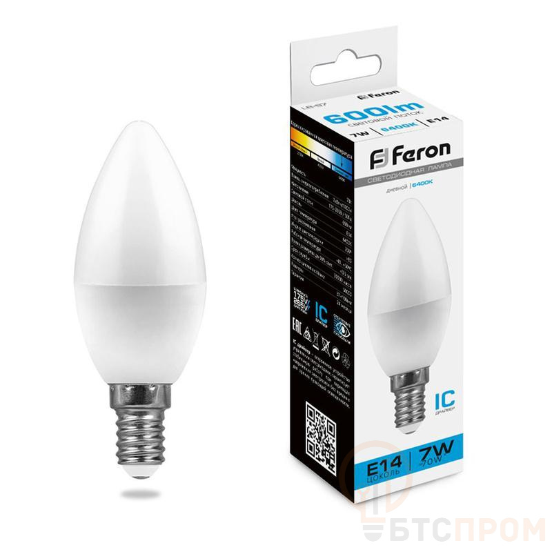 Лампа светодиодная FERON LB-97, C37 (свеча), 7W 175-265V E14 6400К (дневной), рассеиватель матовый белый, 600Lm, угол рассеивания 220°, 100*37мм