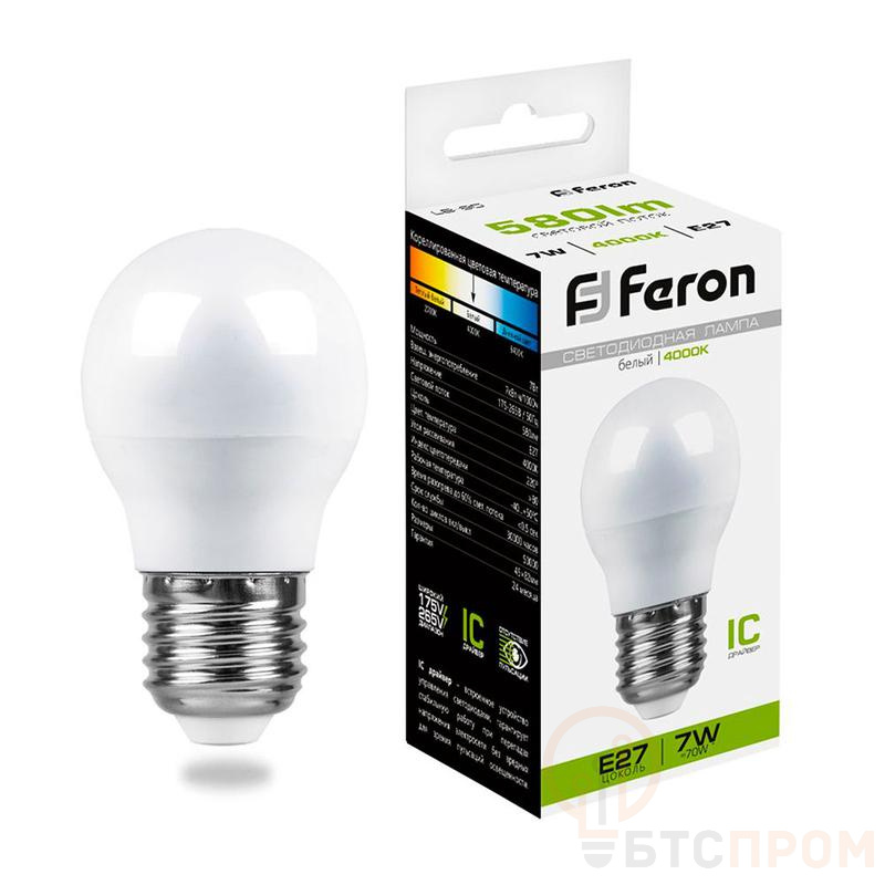 Лампа светодиодная FERON LB-95, G45 (шар малый), 7W 175-265V E27 4000К (белый), рассеиватель матовый белый, 580Lm, угол рассеивания 220°, 80*45мм