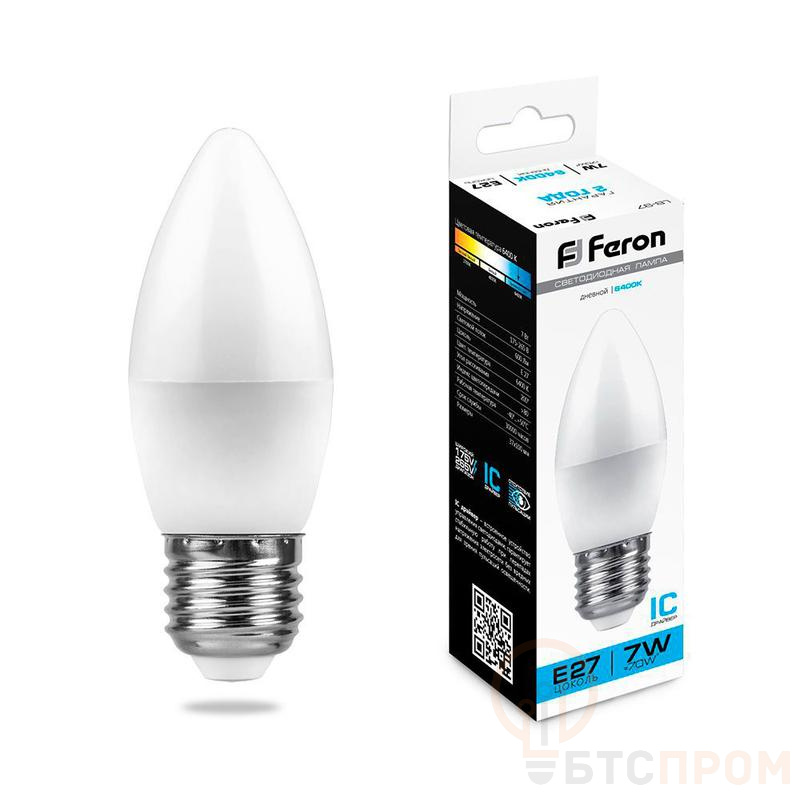Лампа светодиодная FERON LB-97, C37 (свеча), 7W 175-265V E27 6400К (дневной), рассеиватель матовый белый, 600Lm, угол рассеивания 220°, 100*37мм