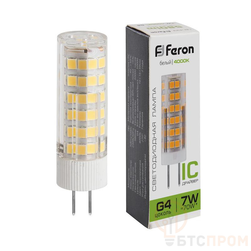 Лампа светодиодная FERON LB-433, JCD (капсульная), 7W 175-265V G4 4000К (белый), рассеиватель прозрачный 580Lm, угол рассеивания 270°, 50*16мм