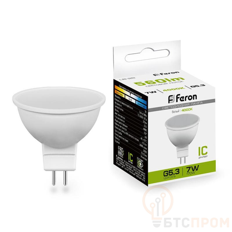 Лампа светодиодная FERON LB-26, MR16 (рефлекторная), 7W 175-265V G5.3 4000К (белый), рассеиватель матовый белый, 570Lm, угол рассеивания 120°, 52*50мм
