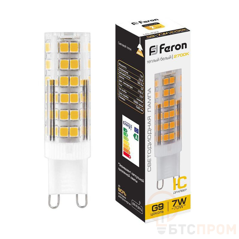 Лампа светодиодная FERON LB-433, JCD9 (капсульная), 7W 175-265V G9 2700К (белый теплый), рассеиватель прозрачный 560Lm, угол рассеивания 270°, 60*16мм