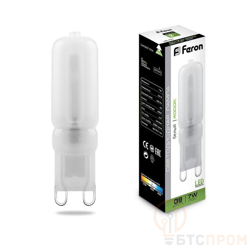 Лампа светодиодная FERON LB-431, JCD9 (капсульная), 7W 230V G9 4000К (белый), рассеиватель матовый белый, 540Lm, угол рассеивания 270°, 60*16мм