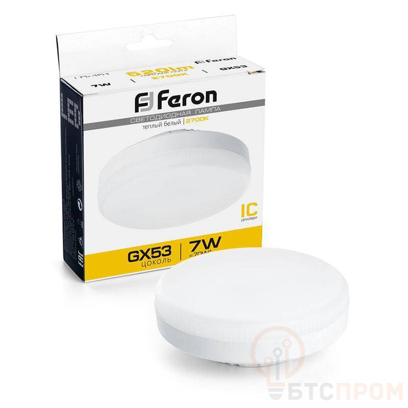 Лампа светодиодная FERON LB-451, GX53 (таблетка), 7W 175-265V GX53 2700К (белый теплый), рассеиватель матовый белый, 520Lm, угол рассеивания 120°, 26*73мм