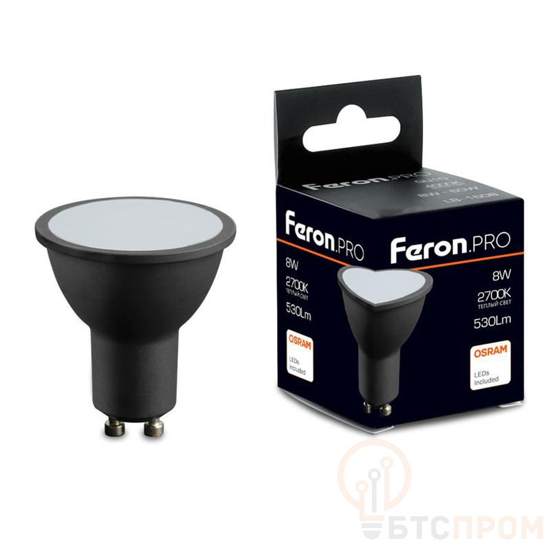 Лампа светодиодная FERON LB-1608, MR16 (рефлекторная), 8W 175-265V GU10 2700К (белый теплый), рассеиватель матовый белый, 530Lm, угол рассеивания 120°, 57*50мм