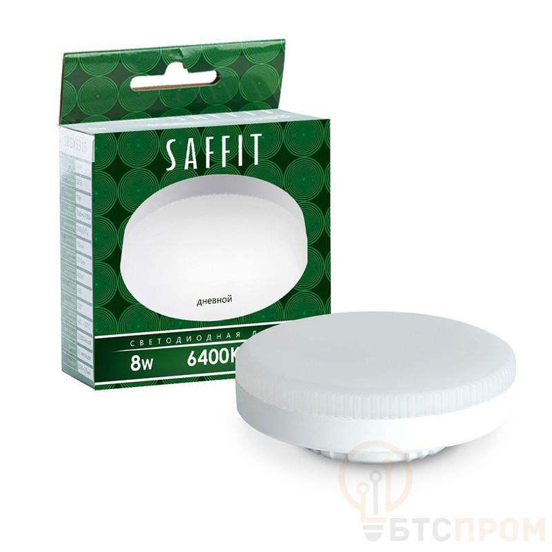 Лампа светодиодная SAFFIT SBGX5308, GX53 (таблетка), 8W 230V GX53 6400К (дневной), рассеиватель матовый белый, 680Lm, угол рассеивания 120°, 26*74мм