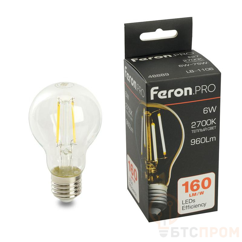 Лампа светодиодная филамент FERON LB-1106, A60 (шар), 6W 175-265V E27 2700К (белый теплый), рассеиватель прозрачный 960Lm, угол рассеивания 270°, 105*60мм