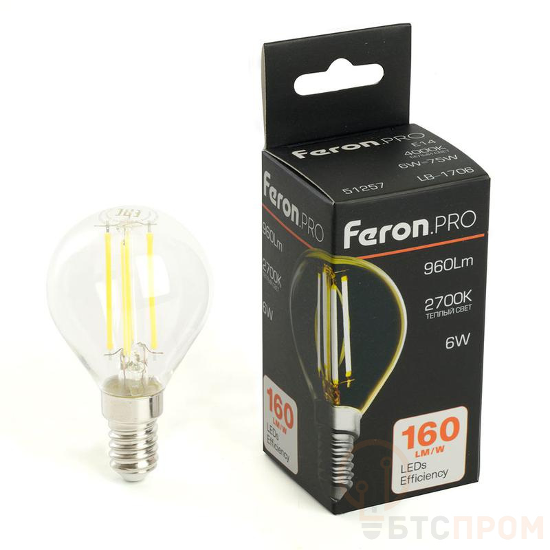 Лампа светодиодная 960лм 6Вт 175-265В E14 2700К G45 прозрачн. LB-1706 FERON 51256 фото в каталоге от BTSprom.by