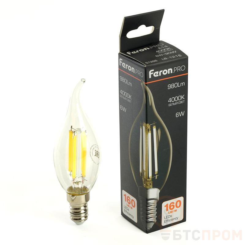 Лампа светодиодная филамент FERON LB-1216, C35T (свеча на ветру), 6W 175-265V E14 4000К (белый), рассеиватель прозрачный 980Lm, угол рассеивания 270°, 115*35мм