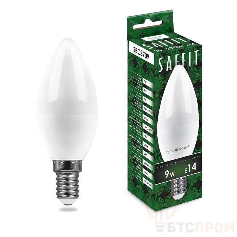 Лампа светодиодная SAFFIT SBC3709, C37 (свеча), 9W 230V E14 2700К (белый теплый), рассеиватель матовый белый, 810Lm, угол рассеивания 220°, 100*37мм