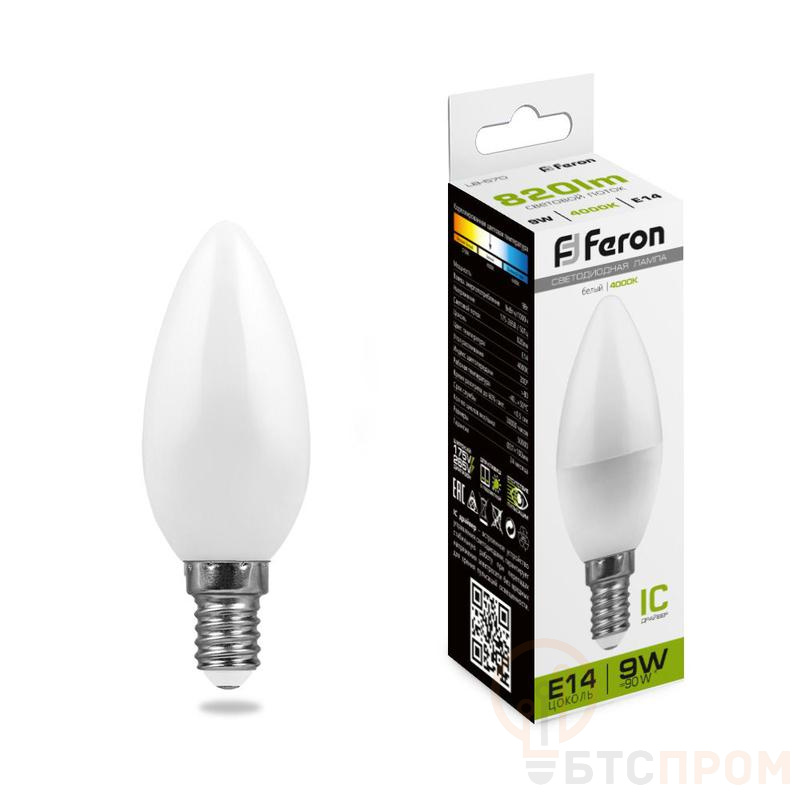 Лампа светодиодная FERON LB-570, C37 (свеча), 9W 175-265V E14 4000К (белый), рассеиватель матовый белый, 820Lm, угол рассеивания 220°, 100*37мм