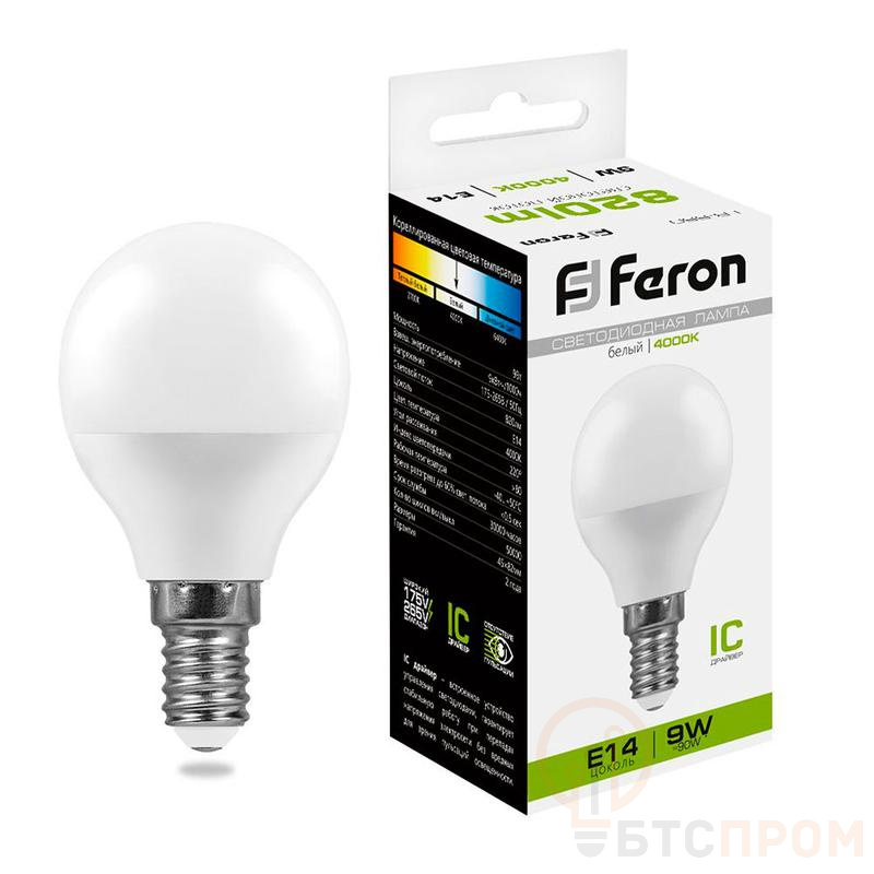 Лампа светодиодная FERON LB-550, G45 (шар малый), 9W 175-265V E14 4000К (белый), рассеиватель матовый белый, 820Lm, угол рассеивания 220°, 80*45мм