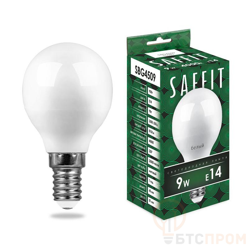 Лампа светодиодная SAFFIT SBG4509, G45 (шар), 9W 230V E14 4000К (белый), рассеиватель матовый белый, 810Lm, угол рассеивания 220°, 80*45мм