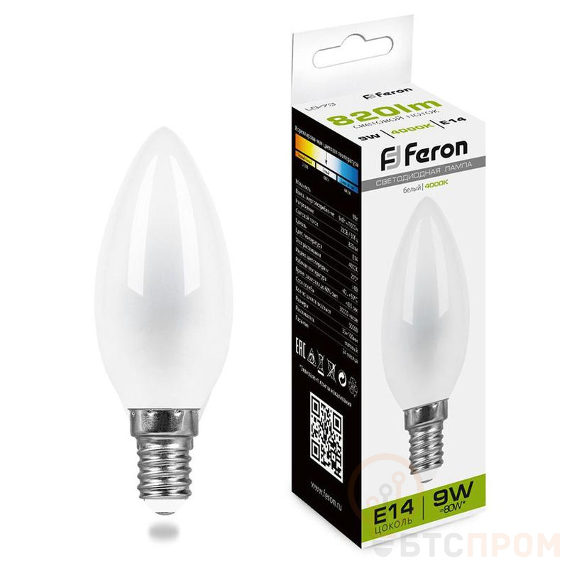 Лампа светодиодная филамент FERON LB-73, C35 (свеча), 9W 230V E14 4000К (белый), рассеиватель матовый белый, 820Lm, угол рассеивания 270°, 100*35мм