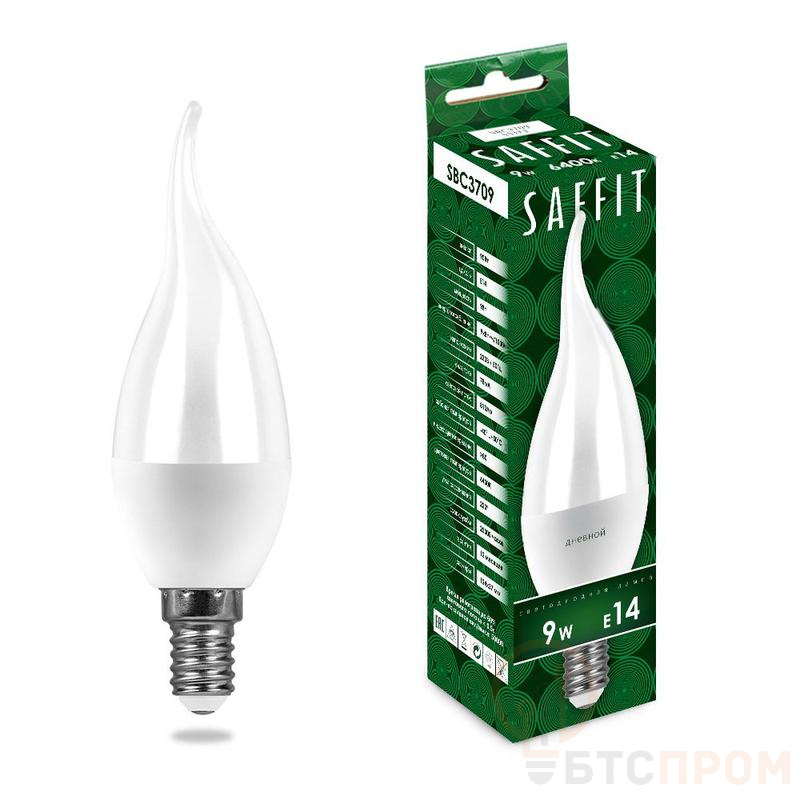 Лампа светодиодная SAFFIT SBC3709, C37T (свеча на ветру), 9W 230V E14 6400К (дневной), рассеиватель матовый белый, 810Lm, угол рассеивания 220°, 124*37мм