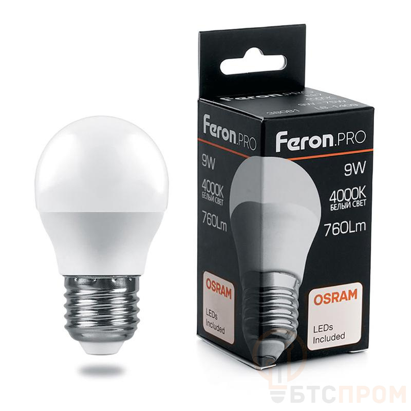 Лампа светодиодная FERON LB-1409, G45 (шар), 9W 175-265V E27 4000К (белый), рассеиватель матовый белый, 760Lm, угол рассеивания 220°, 90*45мм
