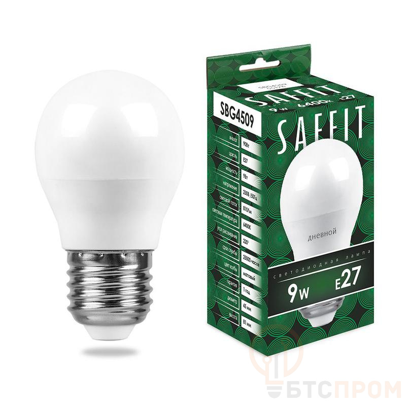 Лампа светодиодная SAFFIT SBG4509, G45 (шар), 9W 230V E27 6400К (дневной), рассеиватель матовый белый, 810Lm, угол рассеивания 220°, 81*45мм