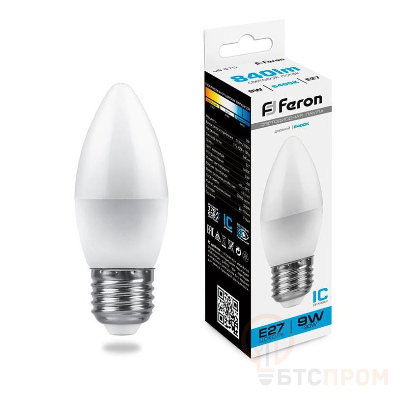 Лампа светодиодная FERON LB-570, C37 (свеча), 9W 175-265V E27 6400К (дневной), рассеиватель матовый белый, 840Lm, угол рассеивания 220°, 100*37мм