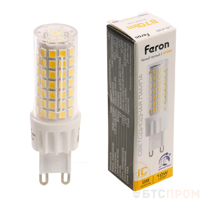 Лампа светодиодная FERON LB-438, JCD9 (капсульная) диммируемая, 10W 175-265V G9 2700К (белый теплый), рассеиватель прозрачный 870Lm, угол рассеивания 270°, корпус пластик, 69*21мм