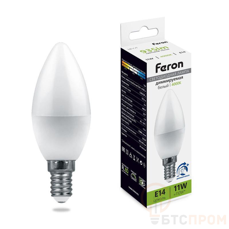Лампа светодиодная FERON LB-771, C37 (свеча) диммируемая, 11W 230V E14 4000К (белый), рассеиватель матовый белый, 935Lm, угол рассеивания 220°, 110*37мм