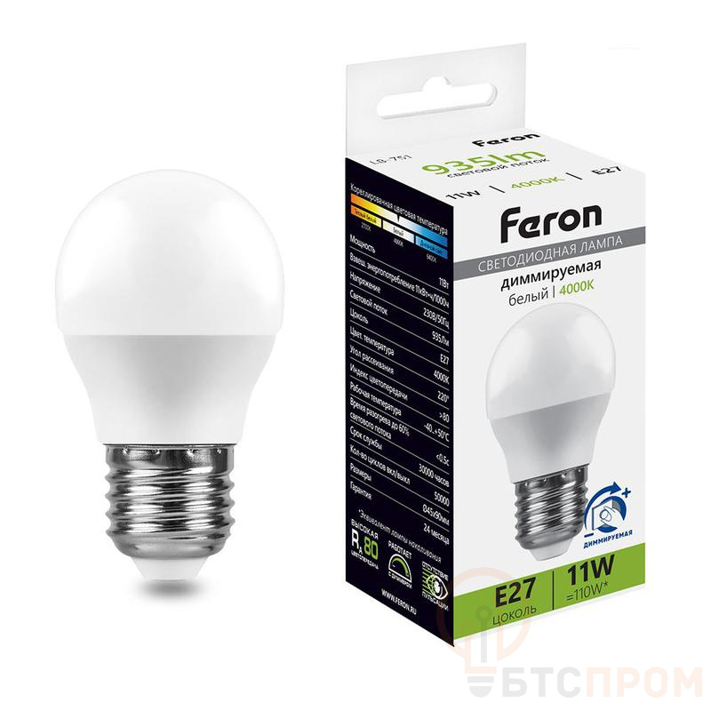 Лампа светодиодная FERON LB-751, G45 (шар малый) диммируемая, 11W 230V E27 4000К (белый), рассеиватель матовый белый, 935Lm, угол рассеивания 220°, 90*45мм