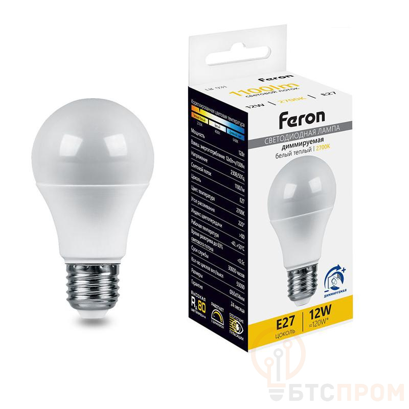 Лампа светодиодная FERON LB-931, A60 (шар) диммируемая, 12W 230V E27 2700К (белый теплый), рассеиватель матовый белый, 1060Lm, угол рассеивания 220°, корпус пластик, 108*60мм