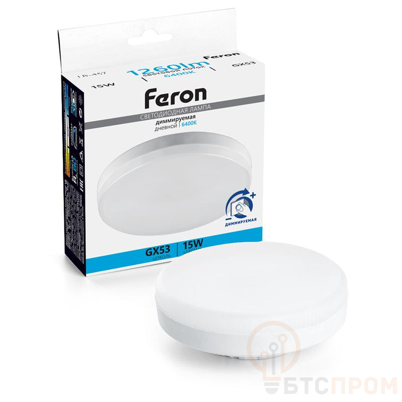 Лампа светодиодная FERON LB-457, GX53 (таблетка) диммируемая, 15W 230V GX53 6400К (дневной), рассеиватель матовый белый, 1260Lm, угол рассеивания 120°, 28*73мм
