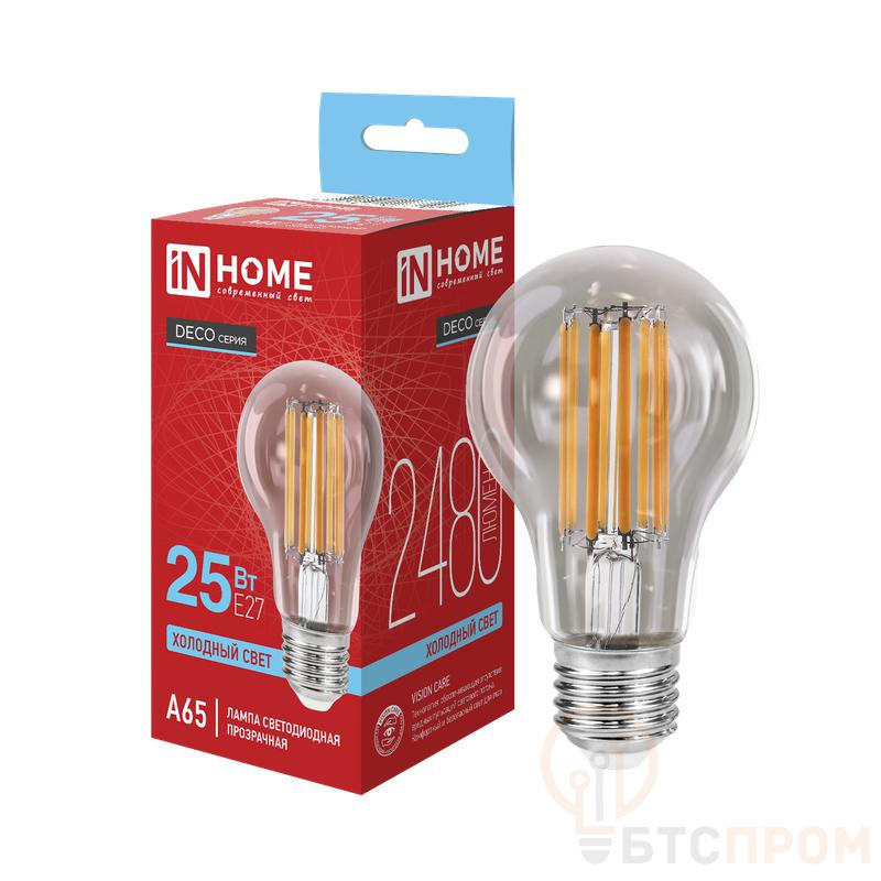 Светодиодная лампа LED-A65-deco — это современное и энергоэффективное решение для основного освещения. Мощность 25 Вт при световом потоке 2480 лм обеспечивает яркий, насыщенный свет, эквивалентный традиционной лампе накаливания мощностью около 200 Вт. Цветовая температура 6500К создает холодный дневной белый свет, который способствует концентрации внимания.