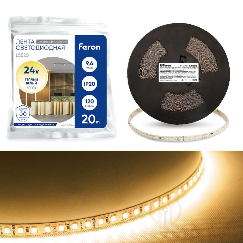 Лента светодиодная 24V FERON LS520, 120*SMD2835, 11W/m, IP20, 3000К (теплый белый), Кратность резки мм 100мм, 20000*10*1.22мм