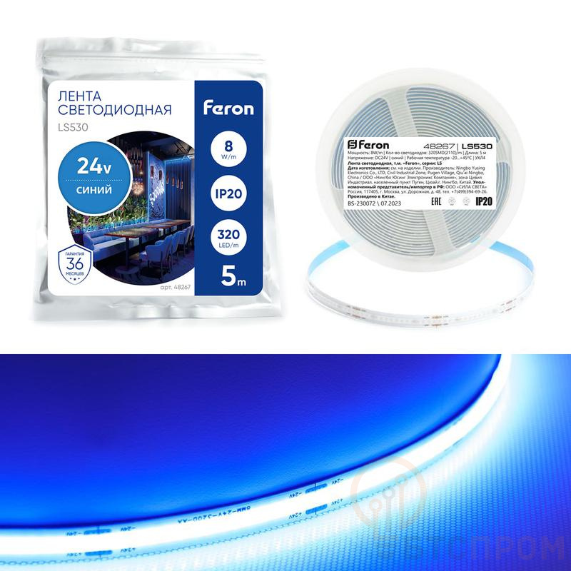 Лента светодиодная 320SMD(2110) 8Вт/м 24В 5000х8х1.8мм IP20 син. LS530 (уп.5м) FERON 48267 фото в каталоге от BTSprom.by