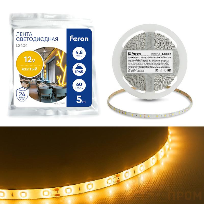 Лента светодиодная 12V FERON LS604, 60*SMD2835, 4,8W/m, IP65, (желтый), Кратность резки мм 50мм, 5000 *8 *3,8мм
