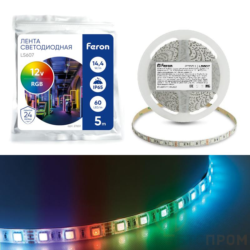 Лента светодиодная 12V FERON LS607, 60*SMD5050, 14,4W/m, IP65, (RGB), Кратность резки мм 50мм, 5000 *10 *3мм