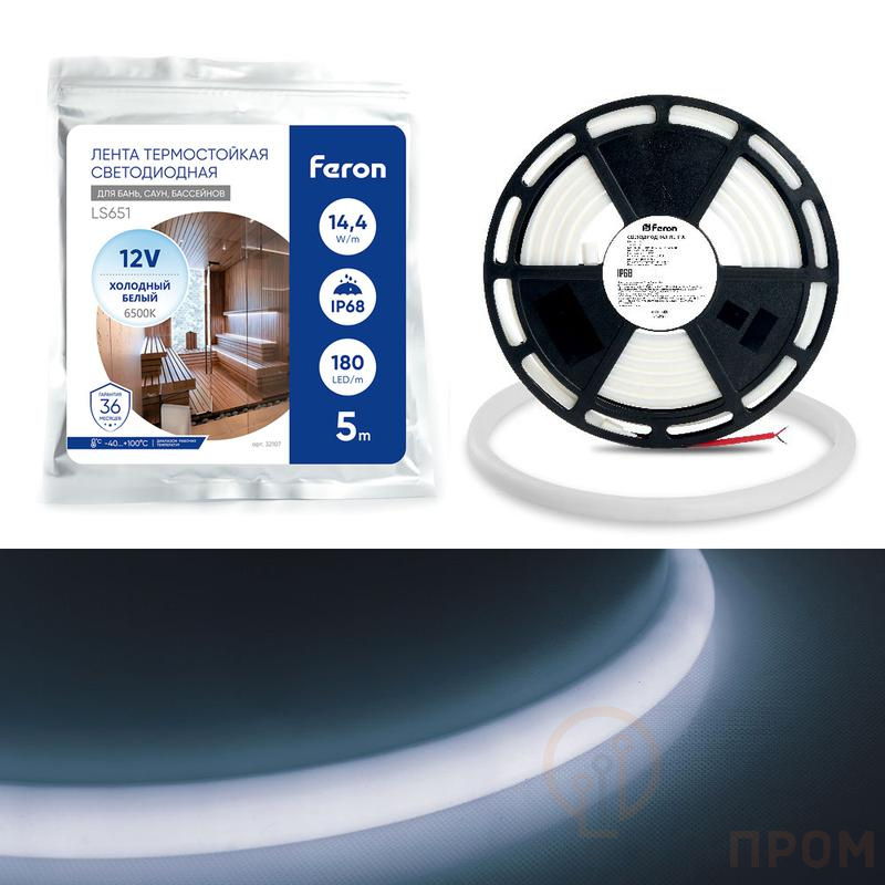 Лента светодиодная неоновая 12V FERON LS651, 180*SMD2835, 14,4W/m, IP68, 6500К (холодный белый), в комплекте 2 заглушки, 2 заглушки c проводом, 10 креплений, Кратность резки мм 16мм, 5000*13*13мм