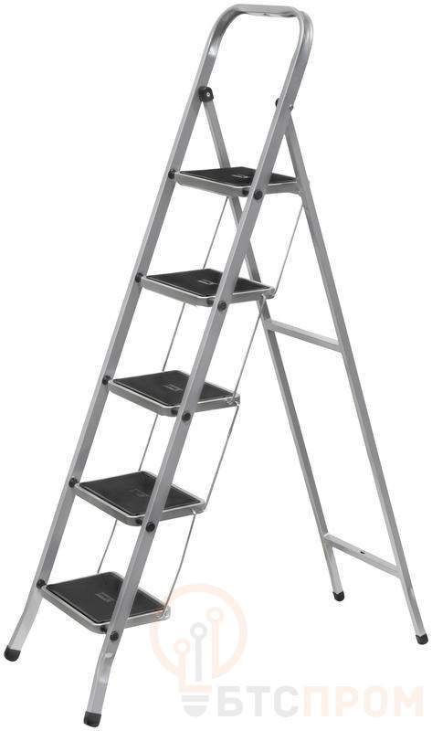 Широкие ступени с пластиковыми ковриками. Размер ступеней 30 х 20 см. Нагрузка допустимая 120 кг. Материал: сталь.