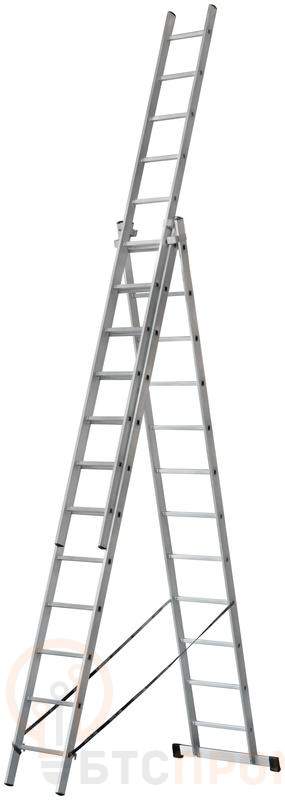 Усиленная трехсекционная алюминиевая лестница FIT РОС рассчитана на нагрузку в 150 кг, подходит для бытового и промышленного применения. Рабочая площадка наверху отсутствует. Модель обеспечена следующими элементами безопасности: ножки закрыты противоскользящими накладками, ременная траверса фиксирует расхождение, надёжный стопорный рычаг держит соединяемые элементы. Двухстороннее расположение ступеней позволяет выполнять подъём в любом направлении. Секции можно использовать отдельно, а также собирать их в различных вариантах, что обеспечивает широкий диапазон применения лестницы.
