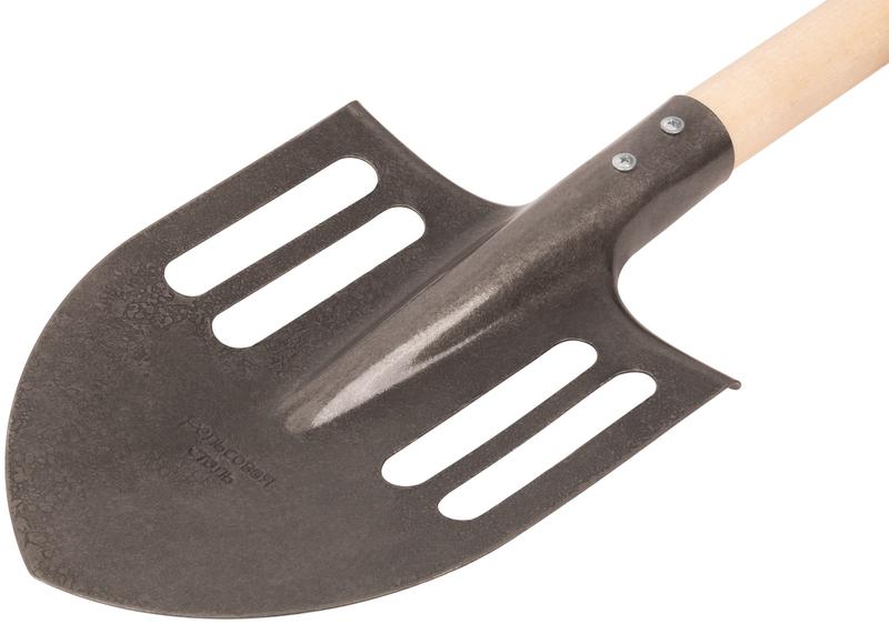 Лопата штыковая облегченная, "рельсовая сталь", с деревянным черенком и V-ручкой. Толщина полотна 1,3 мм. Материал: рельсовая сталь, дерево, пластик.