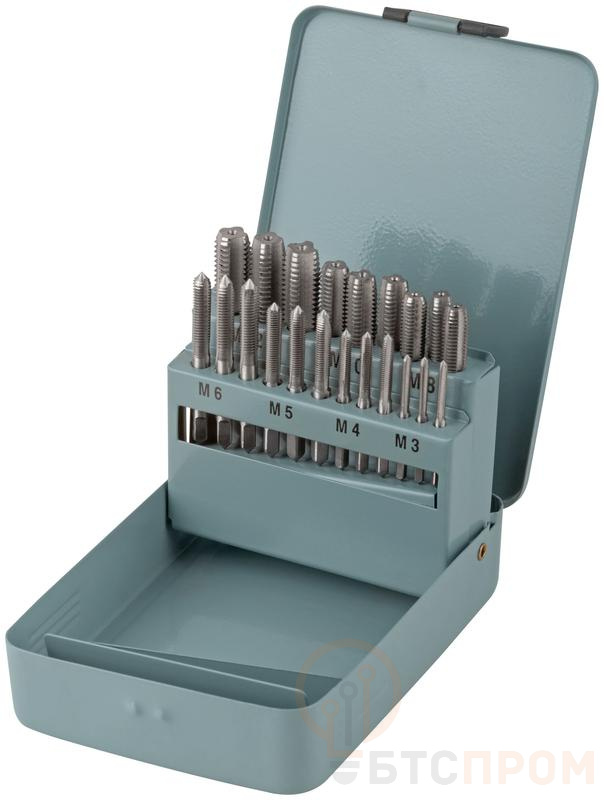 Для нарезания внутренней резьбы на стальных трубах, трубах из цветных металлов и металлических заготовках. В наборе: 21 метчик. Размеры: М3 x 0,5; М4 x 0,7; М5 x 0,8; М6 x 1,0; М8 x 1,25; М10 x 1,5; М12 x 1,75. В каждом размере три вида метчиков: №1 (для предварительного нарезания резьбы), №2 (для повышения точности витков) и №3 (для финишного нарезания резьбы). Материал: легированная инструментальная сталь. Упаковка: металлический кейс.