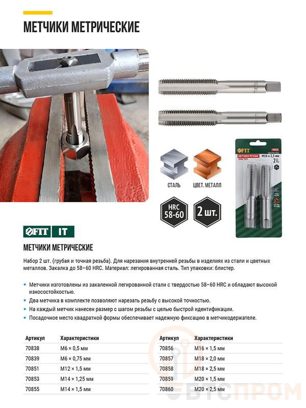 Набор метчиков FIT70856 предназначен для нарезания точной метрической резьбы М16 с мелким шагом 1.5 мм в сквозных и глухих отверстиях. Комплект из двух штук (черновой и чистовой) обеспечивает качественный и последовательный процесс нарезки, снижая нагрузку на инструмент и улучшая чистоту витков.