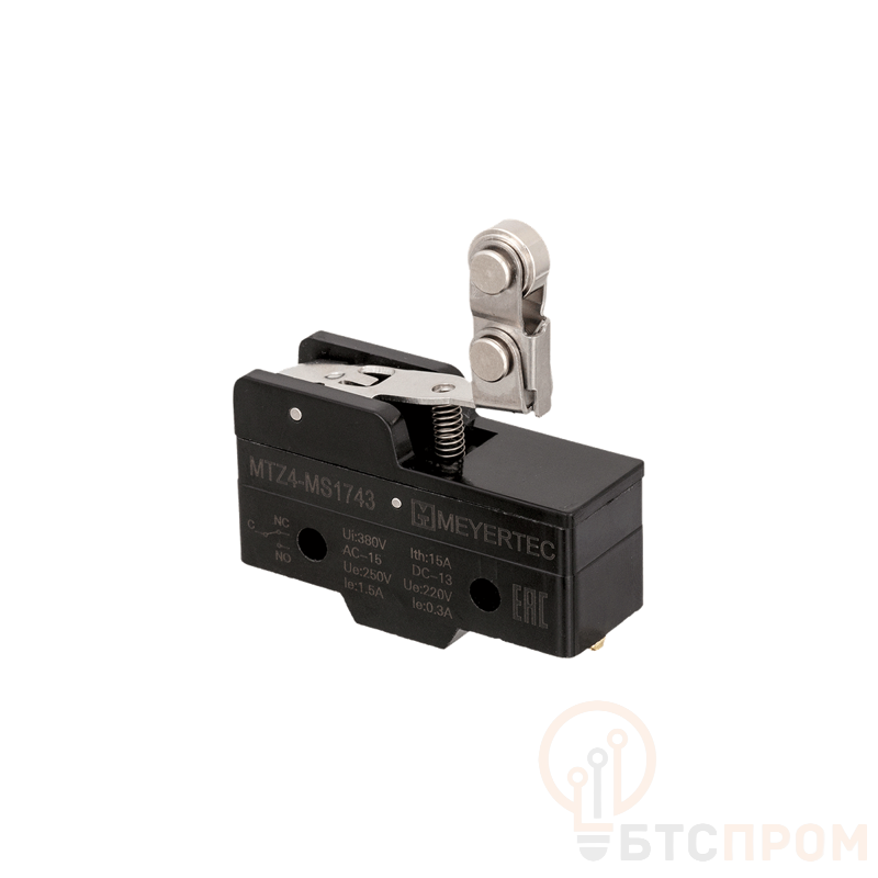 Мини-выключатель концевой MTZ4-MS1743 от ОВЕН — это компактный и надежный прибор для позиционирования и ограничения хода механизмов в системах автоматизации. Модель оснащена поворотным роликом на рычаге, что обеспечивает четкое и плавное срабатывание при контакте с управляющим упором.