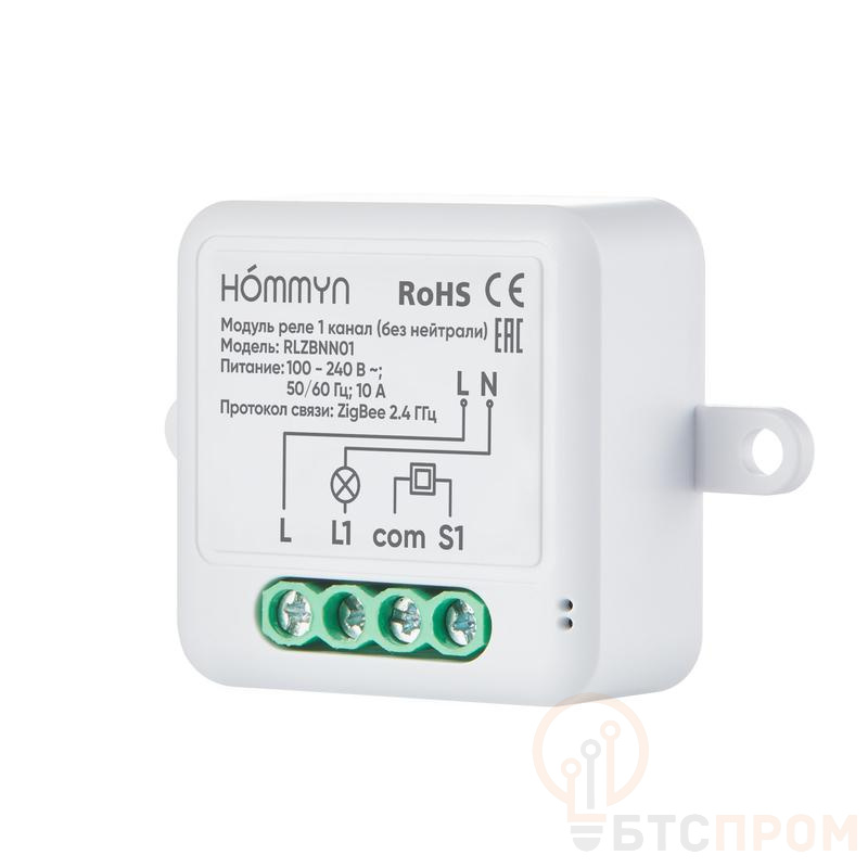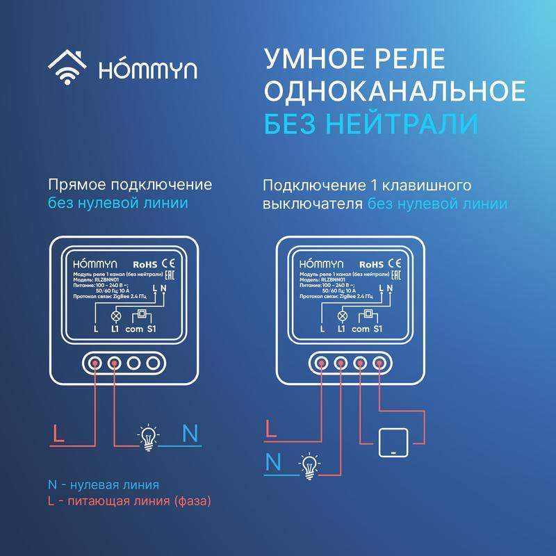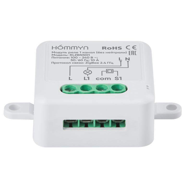 Модуль реле HOMMYN Zigbee 1 канал (без нейтрали) Одноканальное умное реле позволяет «прокачать» ваш любимый домашний «неумный» одноклавишный выключатель, делая его умным, не меняя его оригинальные функции и внешний вид. Компактный размер реле позволяет провести его монтаж в стандартный круглый подрозетник, спрятав его в стене за выключателем. Для подключения требуется только питающая линия L (фаза), нулевая линия N (нейтраль) не требуется. Умное реле позволяет не только управлять включением и выключением освещения или прибором с кнопки вашего оригинального выключателя, но также добавляет возможность удаленного управления через приложение или с помощью голосовых помощников Алиса и Маруся. Реле работает с приложением Hommyn, для подключения требуется Zigbee хаб Hommyn. Реле подключается напрямую к станциям Алиса от Яндекс с Zigbee и работает в приложении Умный Дом с Алисой. Основные функции: · включает и выключает освещение или подключенный прибор по кнопкам, через приложение или с помощью голосовых помощников Алиса и Маруся; · поддерживает настройку по расписанию через приложение; · компактные размеры позволяют смонтировать реле в стандартную круглую монтажную коробку в стене и спрятать его за обычный «неумный» выключатель; · для подключения к электроцепи не требуется нулевая линия N (нейтраль), необходима только питающая линия L (фаза); · реле на 1 канал управляет 1 группой нагрузки (например, 1 лампочка), реле на 2 канала управляет 2 группами нагрузки (например, 2 лампочки); · максимальная нагрузка: до 1100 Вт (резистивная нагрузка); · работает с приложением Hommyn; · работает с приложением Умный Дом с Алисой; · поддерживает сценарии автоматизации с другими датчиками и приборами в приложении Умный Дом с Алисой; · для подключения в приложение требуется либо Zigbee хаб Hommyn, либо станции Алиса от Яндекс с Zigbee. Установка и настройка Монтаж и подключение производится в соответствии с руководством пользователя, прилагаемым к продукту. Нулевая линия N не требуется.